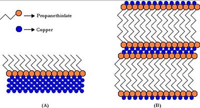 在第一步中,在硫醇和CuO之間發生還原/氧化以形成二硫化物和氧化銅(I)。當硫醇與表面氧化銅(I)反應形成巰基銅(I)時,反應繼續。根據以下反應,在銅金屬和硫醇的表面之間發生類似的化學反應,其中銅金屬用作還原劑以釋放H 2: