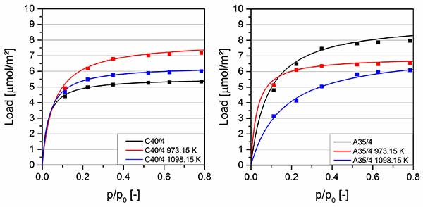圖2顯示極性溶劑丙酮在25攝氏度的吸附等溫線。未涂覆的活性炭A35/4與活性炭C40/4相比的負載顯著較高。兩種碳都是由相同的原料制造的,但活性炭A35/4在水蒸氣氣氛中經過較長時間的活化。由于原始生產過程中氧化條件下活化時間較長,活性炭A35/4具有較高的極性表面基團數量,有利于極性丙酮的吸附。在700攝氏度下涂覆的樣品的負載對于兩種類型的活性炭具有相同的數量級,因為由于內部孔系統的涂覆,表面特性的差異減小,并且表面化學的相關修改。2涂層和極性丙酮,極性活性炭A35/4上的負載僅略有變化。在820攝氏度下涂覆的樣品也具有可比較的負載。由于非極性SiC涂層和由此導致的較弱的相互作用,負載低于在700攝氏度下涂覆的樣品的負載。