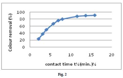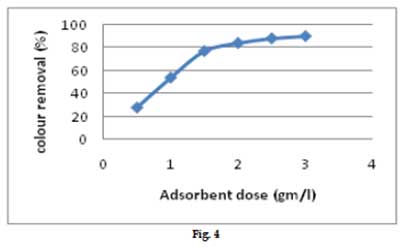 活性炭劑量對顏色去除的影響如圖4所示。觀察到每單位重量活性炭的顏色去除隨著活性炭負載的增加而降低。另一方面,隨著活性炭負載從0.5增加到2.0g / l,去除百分比從28%增加到97%。發(fā)現(xiàn)隨著活性炭的劑量增加至2g/l,顏色的降低增加,并隨著活性炭劑量的進一步增加保持幾乎恒定。