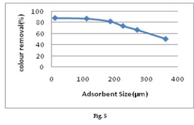 圖5顯示了活性炭顆粒尺寸對去除顏色的影響。從平臺上可以看出,對于固定的活性炭劑量,對于較小的吸附劑尺寸,顏色的去除率較高。此外,可以看出,隨著活性炭尺寸的幾何平均值的增加,去除百分比降低。這是因為,吸附是表面現(xiàn)象,較小的粒度提供相對較大的表面積,因此在平衡時發(fā)生較高的吸附。顆粒大小的影響為實現(xiàn)活性炭的最佳利用和填充床吸收器設計的穿透曲線的性質(zhì)提供了重要的信息。