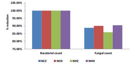 處理的廢水樣品的細菌和真菌分析結果如圖1所示。細菌和真菌計數的NIS限值為0CFU / 100mL,而細菌排放的允許限度并且廢水中的真菌數量是10,000CFU / 100mL。原污水的細菌和真菌數量分別為4,270和2,400 CFU / 100 mL,極高。細菌載量由NCZ大大降低了99.4%(2600CFU / 100mL),99.3%(3000CFU / 100mL),99.3%(3100CFU / 100mL)和99.3%(2800CFU / 100mL) NCH,NHZ和NHH樣品(圖1)。NCZ,NCH,NHZ和NHH樣品的真菌負荷也顯著降低至88.75%(2700CFU / 100mL),90.0%(2400CFU / 100mL),85.83%(3400CFU / 100mL)和90.42% (2300 CFU/100 mL)。