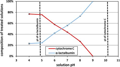 現用活性炭處理1:1溶液后剩余的細胞色素c和α-乳白蛋白的百分比隨溶液pH而變化很大。在pH4.0和5.0時,在等電點4.8附近除去最大量的α-乳白蛋白。(28)相比之下,最大量的細胞色素c在pH9.0被除去,最接近蛋白質的等電點10.5。(27)在6.0或7.0的中等pH下,活性炭除去了相似量的兩種蛋白質。