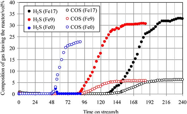 在沒有蒸汽的進料氣流下進行的實驗室測試中,Fe含量為0-17%,突破時間從48小時增加到136小時。Fe負載活性炭表面促進了COS+H 2 →H 2 S+CO反應。采用Fe負載活性炭同時去除H 2 S和COS,利用蒸汽進料氣流,促進反應COS+H 2 O→H 2 S+CO 2和水煤氣變換反應。蒸汽的突破時間幾乎與沒有蒸汽的突破時間相同。然而,含硫化合物對蒸汽的吸附能力高于沒有蒸汽的吸附能力。