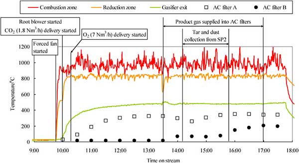 圖2顯示了作為時間函數的氣化器(燃燒區,還原區和氣化器出口)和活化的過濾器A和B的溫度變化。在富氧空氣/CO2氣化操作(10:23-17:41)期間,燃燒區(900-1200℃)的溫度足夠高,而還原區和氣化器出口的溫度保持穩定在大約820和480℃。當產品氣體通過兩個活化的過濾器(13:30-17:00)時,過濾器A和B的溫度分別為250-350和10-200℃。盡管沒有示出,活化的過濾器A和B的溫度穩定在320-350和60-170℃,其中從每個采樣口收集焦油,顆粒和氣體。