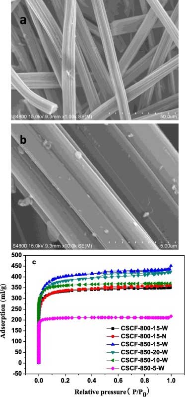 SEM和氮吸附/脫附等溫線進(jìn)行選擇活性炭來(lái)說(shuō)明表面形態(tài)和孔結(jié)構(gòu)。如圖所示圖一,棉桿制成的活性炭形態(tài)是光滑的,并且微晶是清楚的。在不同活化溫度制備四個(gè)選定的樣品的氮吸附等溫線和停留時(shí)間。它可以從中可以看出該四個(gè)選擇的樣本的所有的等溫線顯示了在低的相對(duì)壓力的急劇增加(P / P 0< 0.05),說(shuō)明在碳骨架大量微孔的產(chǎn)生。活性炭的等溫線的下面部分幾乎是線性的,吸附和解吸的分支基本上是一致的。
