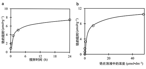 圖2.(a)攪拌時間對活性炭吸附銫的影響。海水中的初始銫濃度=0.075mmol·dm-3。(b)活性炭六氰基鐵酸鉀在海水中的銫吸附等溫線。