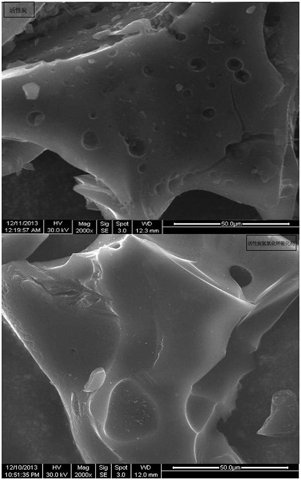 圖2.對(duì)活性炭和活性炭氫氧化鉀固體堿催化劑獲得的SEM圖像。