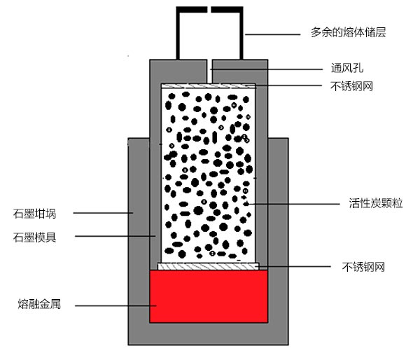 活性炭是性價比高的碳質材料,具有低堆積密度,高比表面積和優異的化學穩定性。它廣泛用于水處理,以吸收飲用水中的雜質。AZ91鎂合金(9重量%Al,1重量%Zn,0.5重量%Mn,余量Mg)用作金屬復合泡沫的基質。活性炭復合泡沫材料的制造,首先將石墨模具填充在四個單獨的填料和振動步驟中,在每個步驟中使用等量的活性炭顆粒。這種壓實方法使整個樣品高度的密度梯度最小化。在該步驟之后,將不銹鋼網插入模具的開口端以將活性炭顆粒保持在適當位置。組裝在充滿氬氣的手套箱內進行,以最小化系統中的氧氣水平。為此,將AZ91合金塊插入石墨坩堝內,并將填充的石墨模具倒置在坩堝內。然后將鋼帽放在模具頂部以在滲透鑄造期間收集過量的熔體。在下一步中,這些部件位于不銹鋼套管內。最后,將組件放入電爐內并在660℃的溫度下保持45分鐘,同時使用保護性氬氣氛以防止鎂合金在鑄造過程中氧化燃燒。通過施加0.02MPa的壓力迫使金屬熔體滲入填充的活性炭顆粒床。在大氣條件下冷卻模具后,手動從模具中取出生產的樣品。圖1顯示了使用的設置的示意圖。