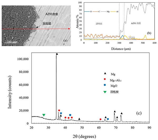 圖3.(a)AZ91基質和活性炭之間界面的SEM圖像,(b)EDS線掃描,(c)活性炭復合泡沫的XRD圖。