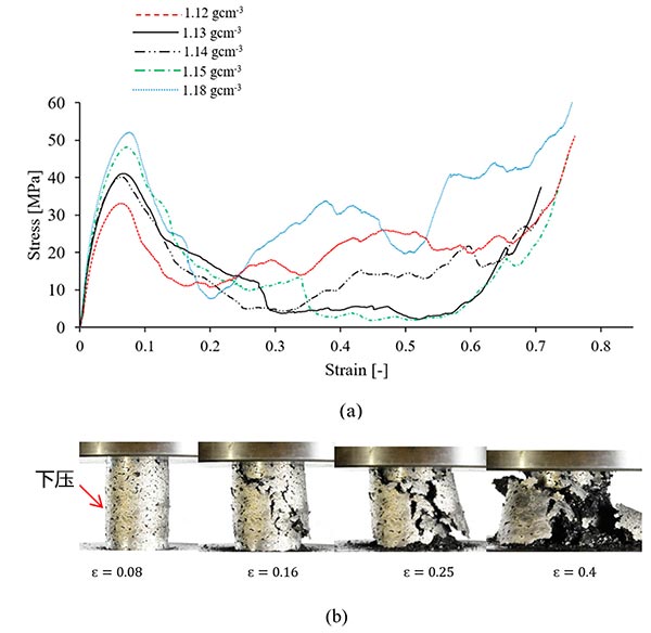 圖4.(a)具有不同密度的活性炭復合泡沫材料的壓縮應力-應變曲線,和(b)密度為1.15g/cm-3的活性炭復合泡沫材料的宏觀變形。